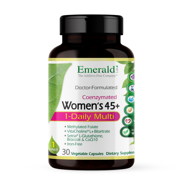 Women's 45+ 1-Daily Multi is a convenient 1-Daily formulated for the unique health needs of Women over 45, including Albion® Chelated Minerals, Antioxidants such as Setria® “Guaranteed Absorption” L-Glutathione, PureWay-C® (12-hour Retention), Sunflower-based Vitamin E (Soy-Free), K2 (Soy-Free as MK-7), CoQ10, extra Vitamin B6, extra Calcium, Broccoli Extract, Coenzymated B’s and Methylated Folate.*